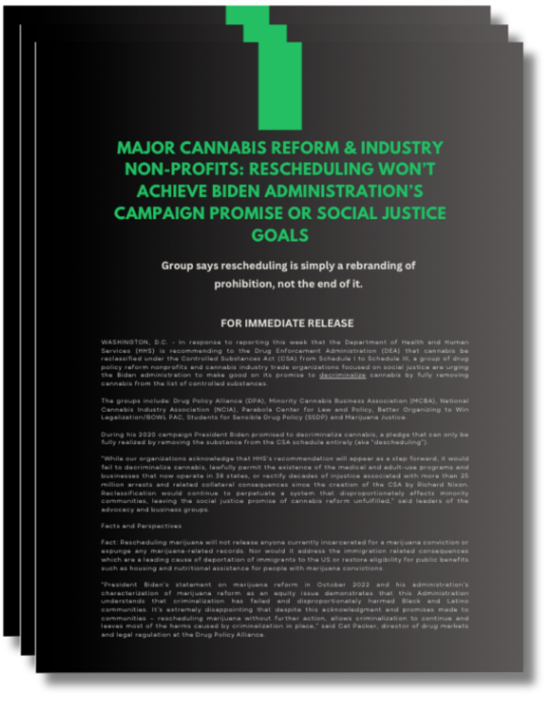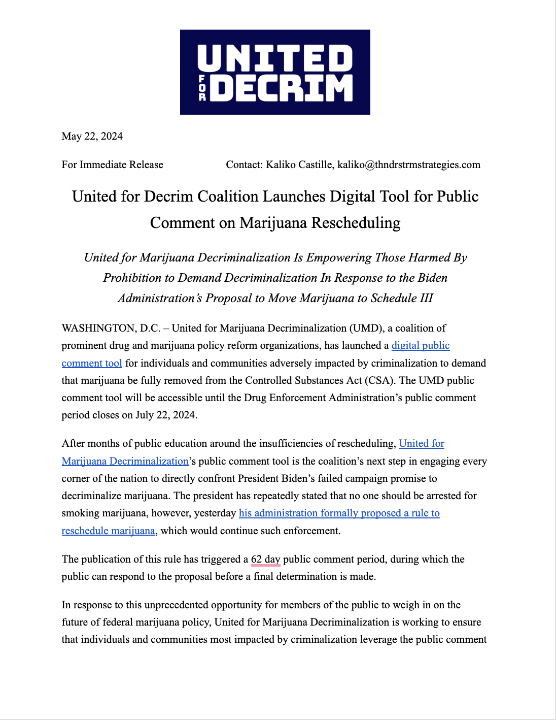 United for Marijuana Decriminalization (UMD), a coalition of prominent drug and marijuana policy reform organizations, has launched a digital public comment tool for individuals and communities adversely impacted by criminalization to demand that marijuana be fully removed from the Controlled Substances Act (CSA). The UMD public comment tool will be accessible until the Drug Enforcement Administration’s public comment period closes on July 22, 2024.